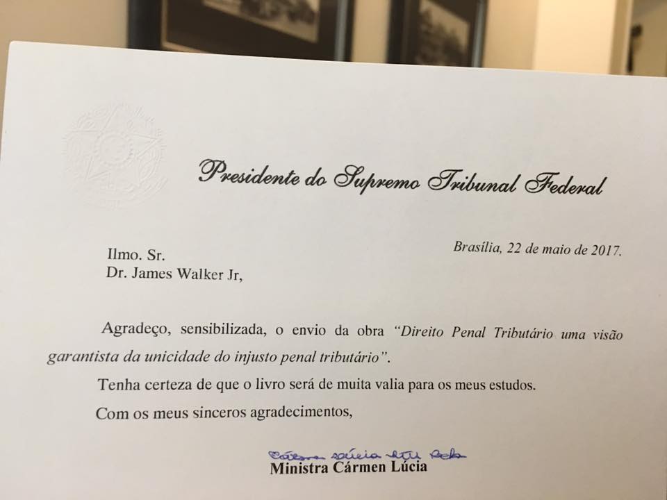 Agradecimento da Ministra Cármem Lúcia Presidente do STF ao Dr. James Walker Júnior