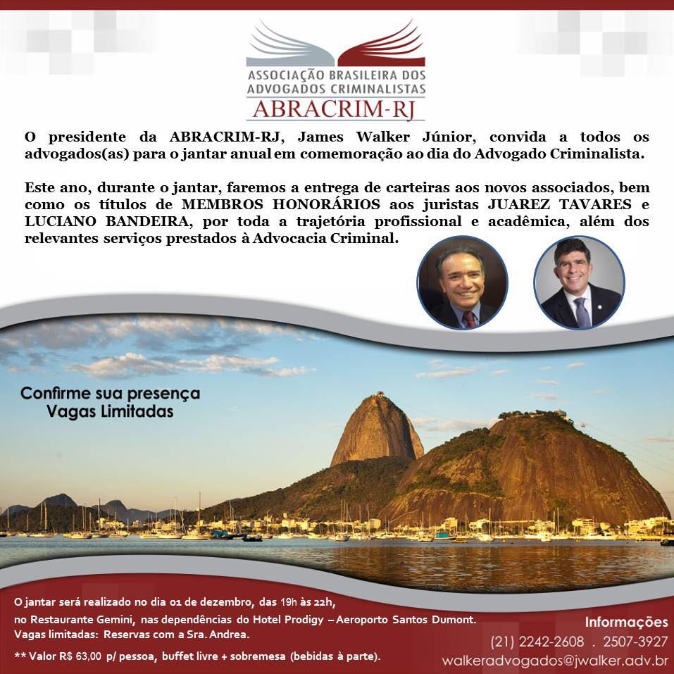 O advogado e professor James Walker Júnior, presidente da ABRACRIM/RJ - Associação Brasileira dos Advogados Criminalistas organizou, juntamente com sua equipe do escritório WALKER ADVOGADOS ASSOCIADOS, o jantar comemorativo ao Dia do Advogado Criminalista (02 de dezembro).
