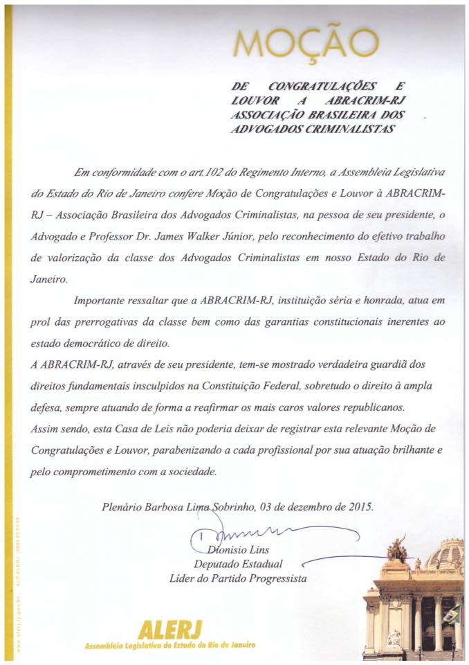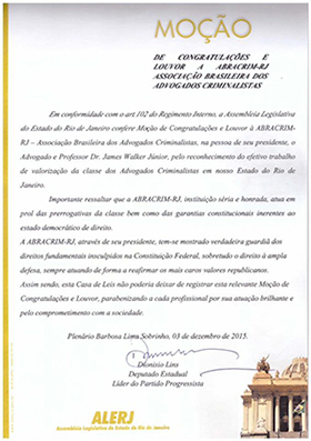 Na qualidade de presidente da ABRACRIM-RJ, o advogado criminalista James Walker Júnior, sócio do escritório WALKER ADVOGADOS ASSOCIADOS recebeu, em nome daquela Associação de Criminalistas, na ALERJ - Assembleia Legislativa do Estado do Rio de Janeiro, a presente Moção de Congratulações e Louvor, pela luta em defesa das prerrogativas e do estado democrático.