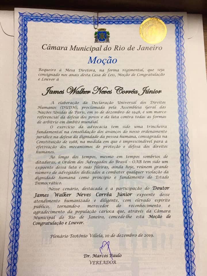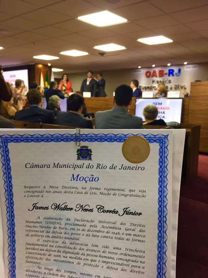 Durante a cerimônia de entrega do Conjunto de Medalhas Pedro Ernesto ao Secretário-geral da OAB-RJ, Dr. Álvaro Quintão, o advogado criminalista e professor James Walker Júnior, sócio do escritório Walker Advogados Associados também foi homenageado com Moção da Câmara de Vereadores do Rio de Janeiro, pelos relevantes serviços prestados à sociedade Fluminense na área de Direitos Humanos.