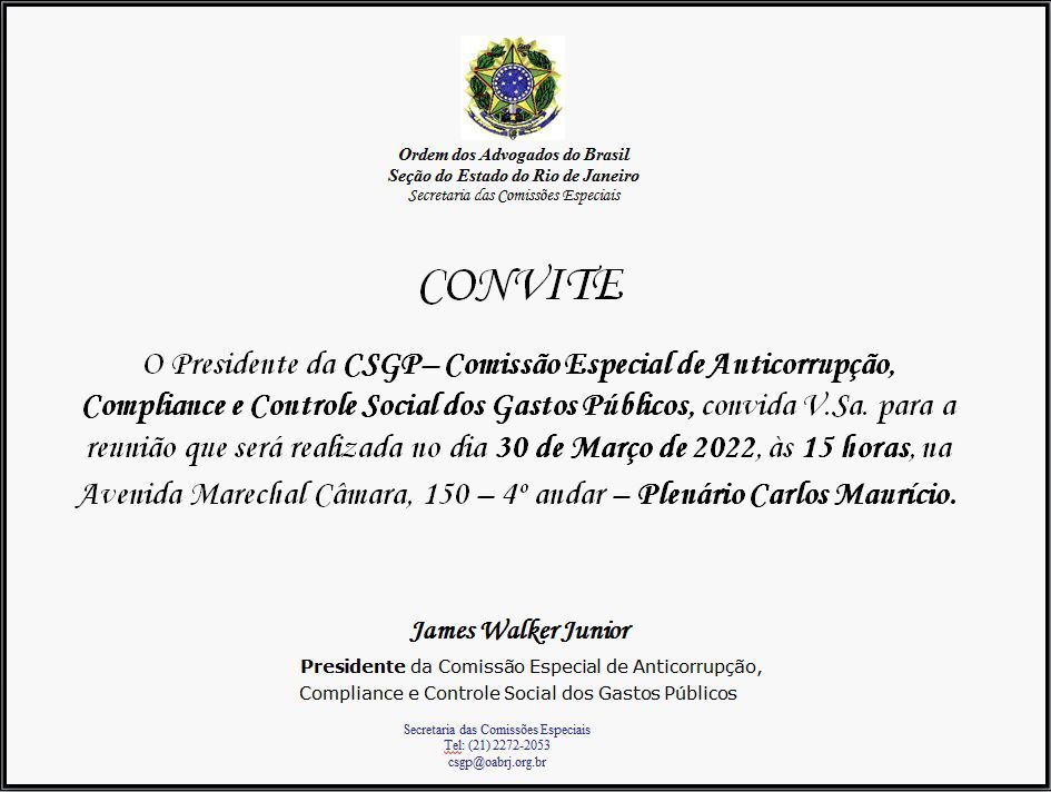 Na qualidade de presidente da Comissão de Anticorrupção, Compliance e Controle Social dos Gastos Públicos da OAB-RJ, convido a todas e todos os interessados em participar da referida comissão, para que compareçam à 1ª reunião, que ocorrerá no dia 30/03/22, às 15h, no Plenário Carlos Maurício (Plenarinho), na sede da OAB-RJ, oportunidade em que começaremos a registrar os nomes dos que quiserem ingressar e atuar perante a comissão”.