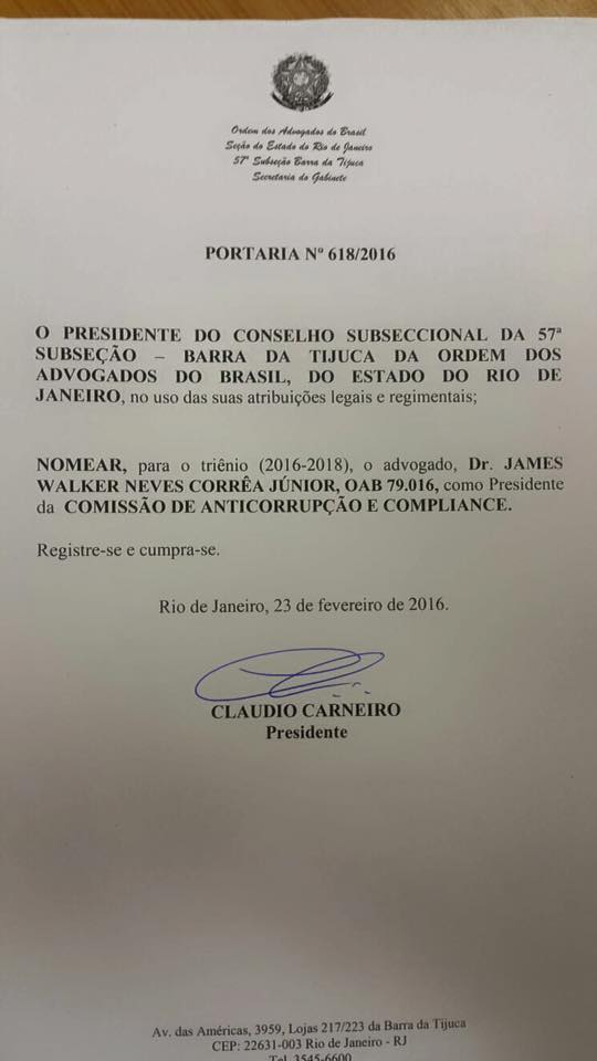 O advogado criminalista e professor James Walker Júnior, sócio do escritório WALKER ADVOGADOS ASSOCIADOS, está sendo empossado presidente da Comissão de Anticorrupção e Compliance da OAB, para o próximo triênio.