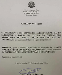 O Dr. James Walker recebe essa honrosa atribuição por designação do presidente da OAB Barra da Tijuca Dr. Claudio Carneiro.