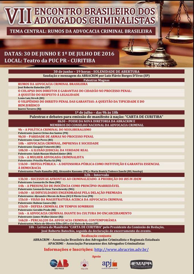 O VII EBAC - Encontro Brasileiro dos Advogados Criminalistas ocorrerá nos dias 30/06 e 01/07 em Curitiba.