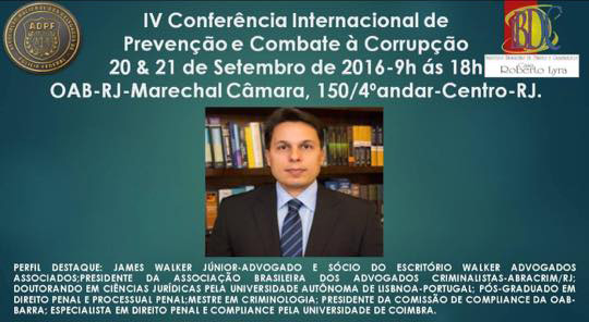 O advogado e professor James Walker Júnior, sócio do escritório WALKER ADVOGADOS ASSOCIADOS será um dos palestrantes da IV Conferência Internacional de Prevenção e Combate à Corrupção que será realizada na sede da OAB-RJ.