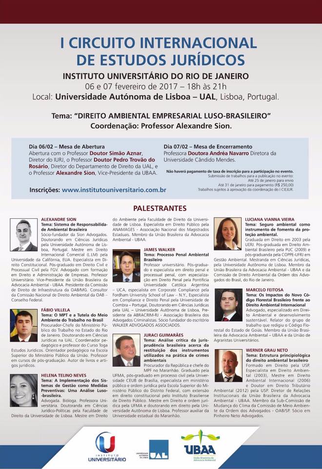 Nos dias 06 e 07 de fevereiro de 2017, na UAL - Universidade Autônoma de Lisboa, será realizado o I Circuito Internacional de Estudos Jurídicos, uma iniciativa do Iurj Rio de Janeiro.