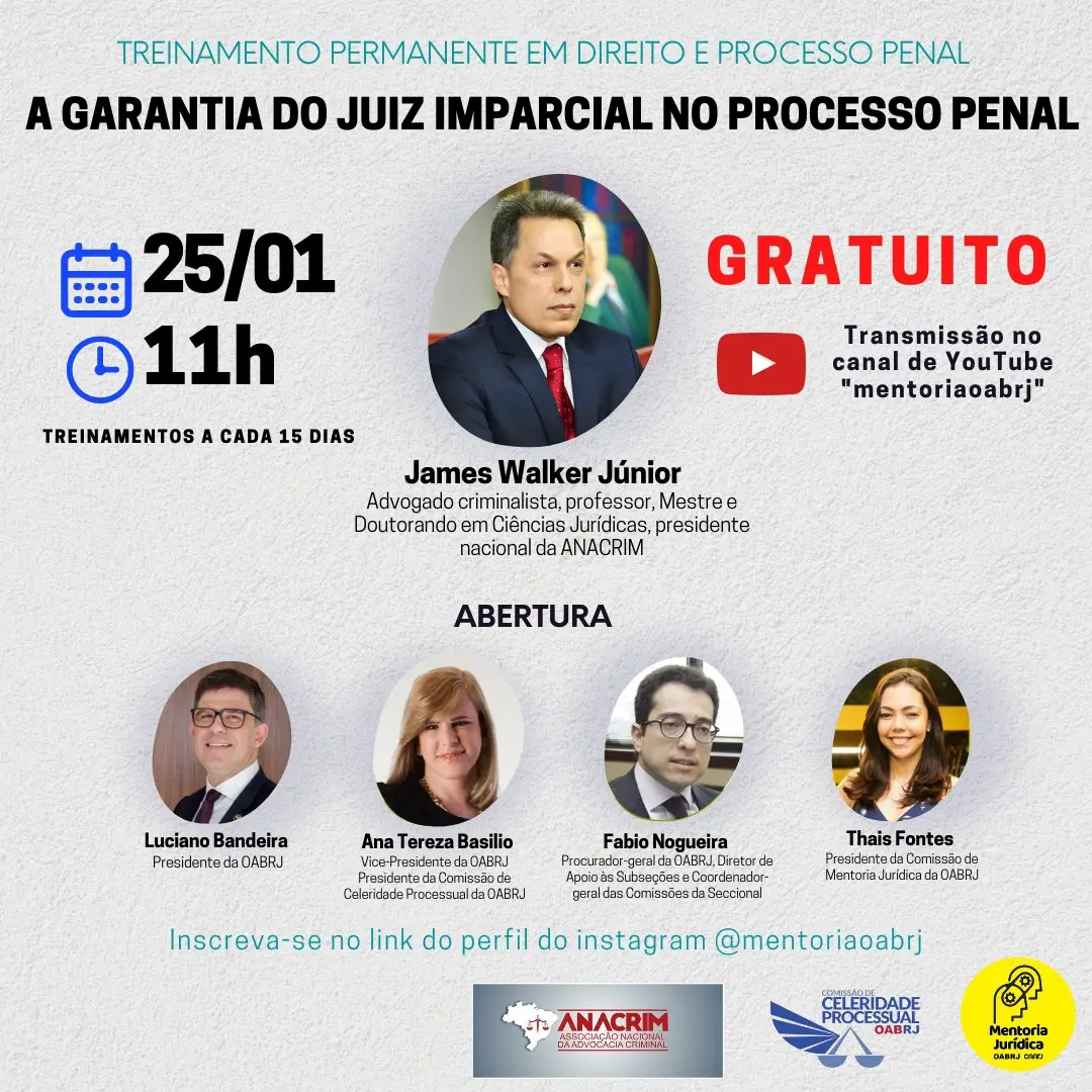 Será uma aula do advogado criminalista e professor James Walker Júnior, sócio do escritório Walker Advogados Associados e presidente nacional da ANACRIM, com o tema: “A garantia do juiz imparcial no processo penal”.