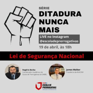 Na próxima segunda-feira (19/04/21), às 18h, o advogado criminalista e professor James Walker Júnior, presidente da ANACRIM – Associação Nacional da Advocacia Criminal e sócio do escritório Walker Advogados Associados fará uma Live intitulada: “Ditadura nunca mais – Lei de Segurança Nacional”.