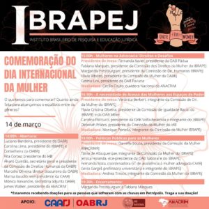 O IBRAPEJ, através das suas comissões dos Direitos da Mulher e dos Direitos Humanos, realizará, na próxima quinta, dia 14/03, das 14:00 às 20:00h, um evento comemorativo ao Dia Internacional da Mulher, na sede da OAB-RJ, localizada à Av. Mal. Câmara, 150, 4° andar, com apoio da OABRJ, CAARJ, IAB e ANACRIM.