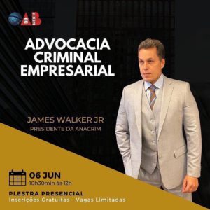 A OAB Méier tem a alegria de realizar a palestra presencial “Advocacia Criminal Empresarial” com o Dr. James Walker Jr, advogado criminalista com reconhecida atuação no cenário nacional, presidente da ANACRIM – Associação Nacional da Advocacia Criminal e sócio do escritório Walker Advogados Associados, verdadeira referência da advocacia criminal fluminense.